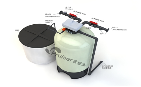 鹽吸收(再生):將鹽水注入樹脂罐的過程。傳統設備使用鹽泵來注入鹽水。全自動設備使用專用的內置噴射器來抽吸鹽水(只要水具有一定壓力即可)。在實際的工作過程中,以較慢的速率流經樹脂的鹽水的再生效果要好于簡單地用鹽水浸泡樹脂的效果,因此,通過使鹽水緩慢流過樹脂的方法來再生軟化設備。此過程通常需要60大約幾分鐘,實際時間受所用鹽量的影響。